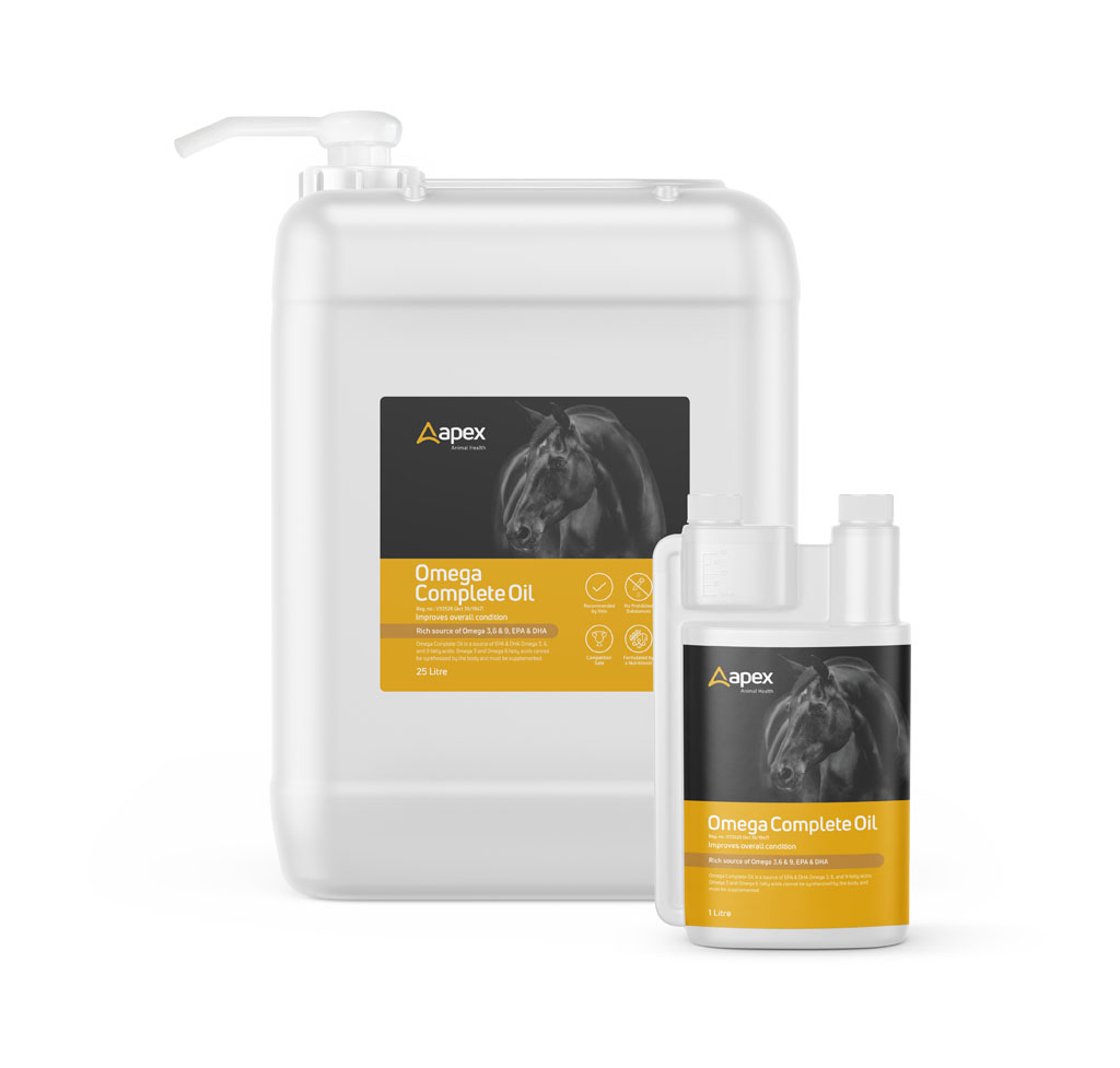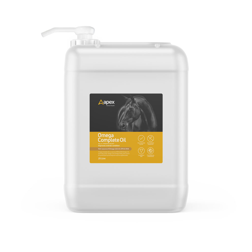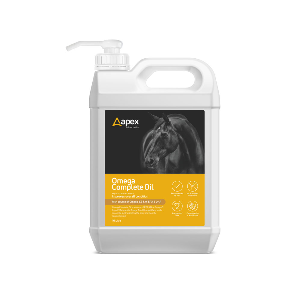Apex Animal Health’s Omega Complete Oil is a source of EPA & DHA Omega 3, 6, and 9 fatty acids. Omega 3 and Omega 6 fatty acids cannot be synthesized by the body and must be supplemented. Omega Complete Oil assists with conditioning, improving skin & coat health, managing a healthy gut, and improving respiratory function by naturally reducing inflammation in the body.